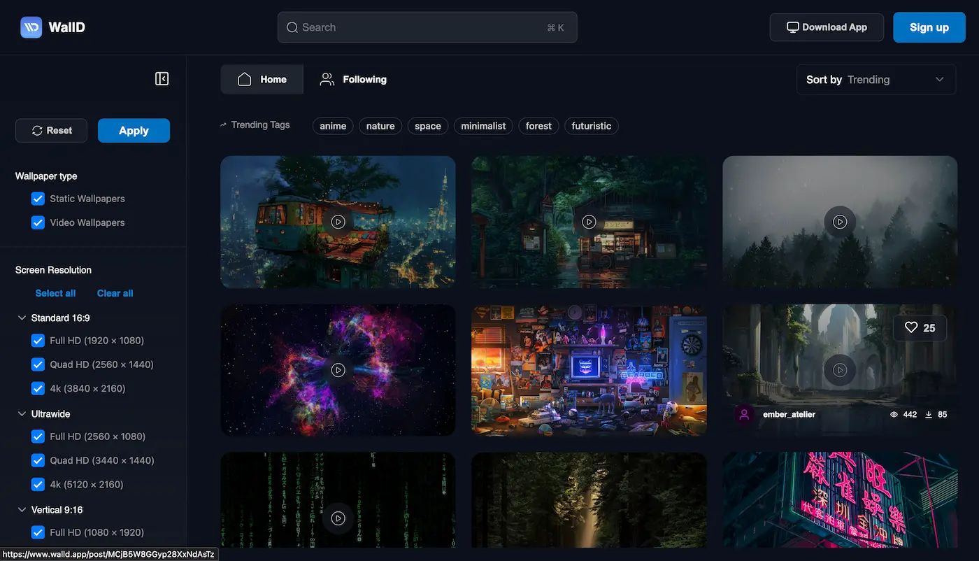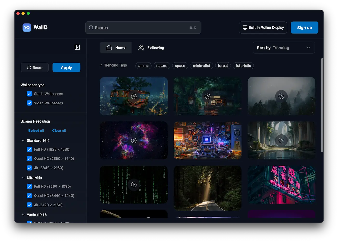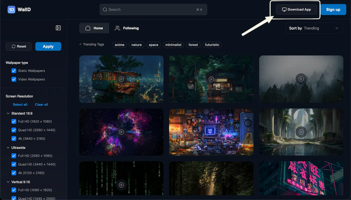 WallD opens straight to the wallpaper feed, so you can start browsing right away. When you find a wallpaper you want to apply, click it. You’ll be prompted to sign up at that point.
