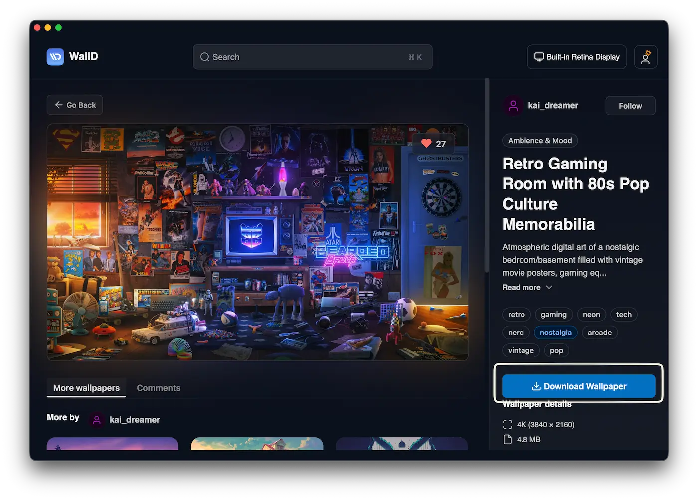 You’re in! Browse the WallD library - static and animated 4K wallpapers from the community. Open any wallpaper to preview it, and you’re just two clicks away from a new desktop.