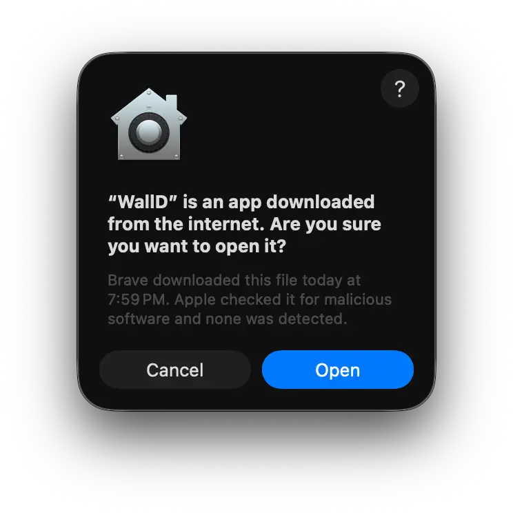 macOS will ask you to confirm opening an app downloaded from the internet. Click Open to proceed.